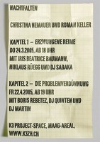 NACHTFALTEN KAPITEL 1 – ERZWUNGENE REIME Donnerstag, 24.3.05, ab 18 Uhr Christina Hemauer, Roman Keller mit Iris Beatrice Baumann und Niklaus Rüegg 18 Uhr: Dämmerung 20 Uhr: Performances ab 23:00 Uhr: DJ Sabaka