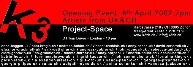Opening Event 6th April 2002, 7pm Artists from UK & CH 7 pm private view / vernissage / bar 8 - 8.30 pm first videoblock 8.30 - 9.30 pm soup is served 9.30 pm second videoblock 10 pm party with dj tom driver / bar