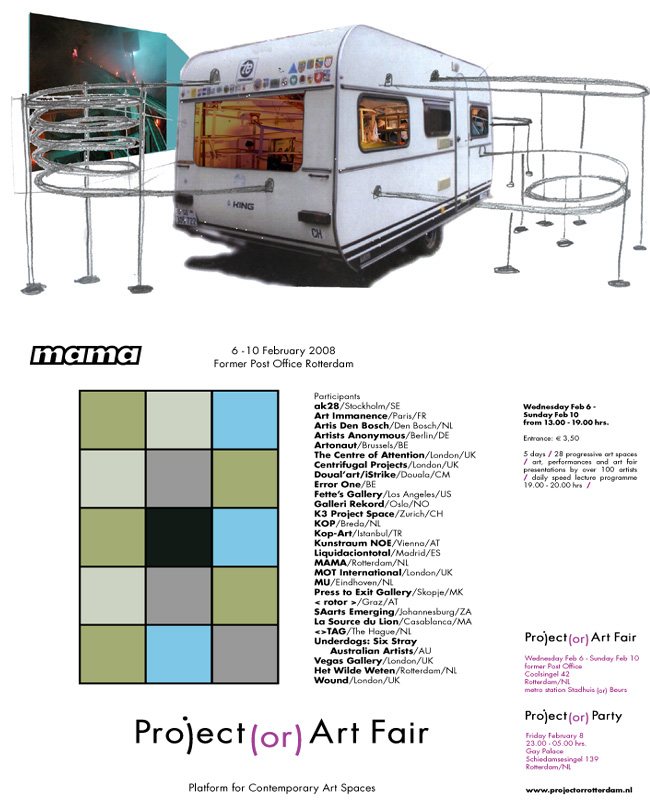 K3 Project Space goes to Rotterdam with a new edition of the Trans K3 Express by Sergej Klammer and Sandi Paucic with artists from CH and NL. K3 at Project(OR) – platform for contemporary art spaces. 6 until 10 February 2008 (during Art Rotterdam) For more information visit http://www.showroommama.nl PREVIEW: KUNSTHOF ZÜRICH, Friday 1st FEBRUARY 2008: 17.30-22.00h (one evening only). Limmatstrasse 44, 8005 Zürich, www.vbk.zhdk.ch/kunsthof/ K3 Project Space Zurich presents: Trans K3 Express A Train journey by Sergej Klammer & Sandi Paucic, with the participation of Swiss, UK and Dutch artists. With: Barbara Davi, Marianne Engel, Leo Fitzmaurice, Daniel Gafner, Claudius Gentinetta, Clare Goodwin, Bob Gramsma, Paul Harper, Haruko / Josef Loretan, Andrea Heller, Christina Hemauer / Roman Keller, Hipp, Susanne Hofer, Beat Huber, Thomas Isler, Beat Klein / Hendrikje Kühne, Koefer / Hess, Isabelle Krieg, Max Mason / Liz Murray, Anja Moers, Monica Germann / Daniel Lorenzi, Nils Nova, RELAX chiarenza & hauser & co, Anina Schenker, Juliana Smith, Ron Temperli, Costa Vece, , Markus Weiss, Yuri A., ZündWerk A model train installation has been built in an old caravan and will be parked in front of the main entrance of the old post office, where the Project(OR)-show is taking place. The train installation will also spread out over curved bridges into the open space around the vehicle. In place of the usual miniature landscape for model trains to travel through, Sergej Klammer and Sandi Paucic have chosen works by around 30 artists, mainly from Switzerland but also from the UK and Holland, assembling them into one big installation. The trains are equipped with cameras as they travel through the ‘artscape’, over bridges and through tunnels and valleys. The caravan can be seen as a big analogue video machine that produces images of art. These images will also be transmitted live into the K3 exhibition booth creating a very special art journey.
