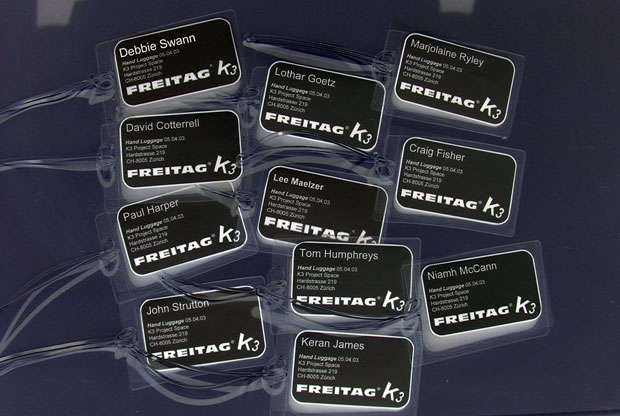 Hand Luggage April 5th - 6th 2003 Sponsored by www.freitag.ch in collaboration with K4 Curated by Clare Goodwin and Rebecca Geldard David Cotterrell, Craig Fisher, Lothar Goetz, Paul Harper, Keran James, Tom Humphreys, Lee Maelzer, Niamh McCann, Marjolaine Ryley, John Strutton, Debbie Swann. 7pm, K3, Opening event Special guests 7.30pm, K3/K4 performance by ‘mit’, Jogging from her home at the Grunau to Maag Areal (Klodin Erb, Sabine Hagmann, Reula Michell, Eliane Rutishauser, Karoline Schreiber, Mirjam Staub, Theres Waeckerlin, Meret Wandeler, Agatha Zobrist, Hanna Zullig) www.mitimnetz.ch 7pm -8.30pm, video screening in K4 bar by Abigail Reynolds, Wohnen fur Alle 8.30pm, K4, performance by Yan Duyvendak, You invited me don’t you remember? 9.30pm K4, live music performed by Car Crasherette 10.30pm-open end, K4, party with DJ’s and bar Yan Duyvendak co-production, Stiftung Kunst Heute, Bern and Centre pour l''Image Contemporaire (sgg*) Saint-Gervais Gènève. www.duyvendak.com Party with www.djpatnightingale.com