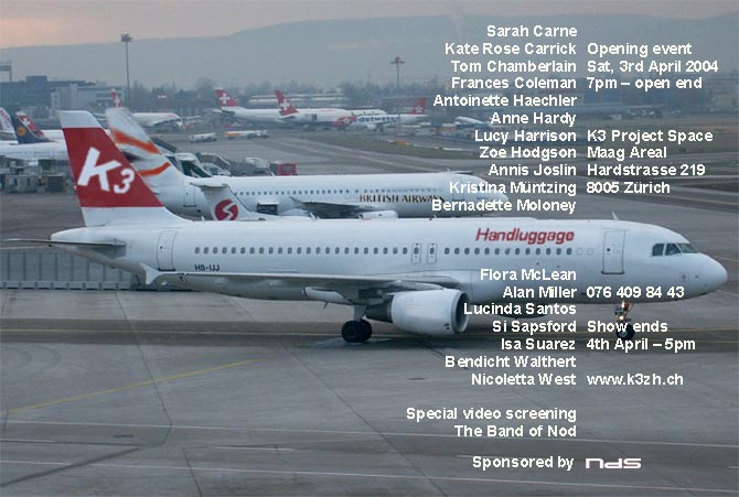 Opening event, Saturday 3rd April-7pm Show ends 4th April-5pm Sarah Carne, Kate Rose Carrick, Tom Chamberlain, Frances Coleman, Antoinette Haechler, Anne Hardy, Lucy Harrison, Zoe Hodgson, Annis Joslin, Kristina Müntzing, Bernadette Moloney, Flora McLean, Alan Miller, Lucinda Santos, Si Sapsford, Isa Suarez, Bendicht Walthert, Nicoletta West Special video screening - The Band of Nod www.thebandofnod.com SPONSORED by NDS bags www.nds.ch